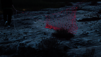 오래전 땅에 묻힌 편지는 공간적으로 이미 도착했지만, 많은 시간을 이동하여 발견된 순간에야 비로소 전송이 완료된다. 차올랐던 수면이 다시 내려갈 정도의 시간이 흐른 후에 편지는 발견된다. 과거에서 전송된 편지를 건져올리기 위해 낚싯줄을 던진다. 편지 위에는 잉크의 흔적과 글이 있었던 자리만 남아 있다. 우리는 ‘글을 써 내려간다.’고 말하지만 글은 한 글자씩 옆으로 추가된다. 지형이 변하듯 시간이 축적되면서 이야기는 끝을 향해 흘러가지만 이미지는 화면 위에서 저장되기보단 계속해서 나아가기에, 고정된 순간보단 휘발의 순간을 더욱 극명하게 드러낸다. 묻힌 것들을 낚기 위해 아래로 던져진 낚싯줄은 바닥 위에 부딪힌다. 지면과 종이를 오가는 줄들은 그물처럼 엮여 칸을 만들고 다음 칸, 다음 글로 이동한다.